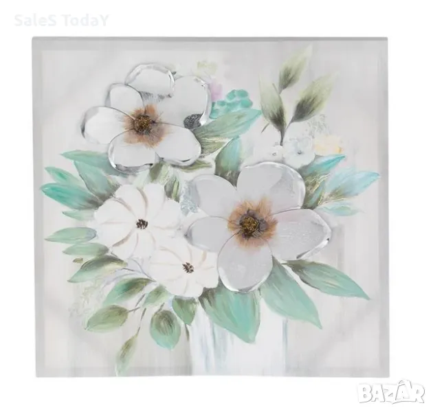 Декоративна маслена живопис върху платно с флорален дизайн и 3D метални детайли върху цветни листенца. Дължина x Ширина x Височина 60х60х2,5см