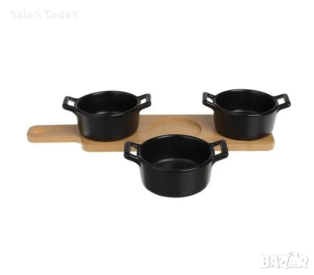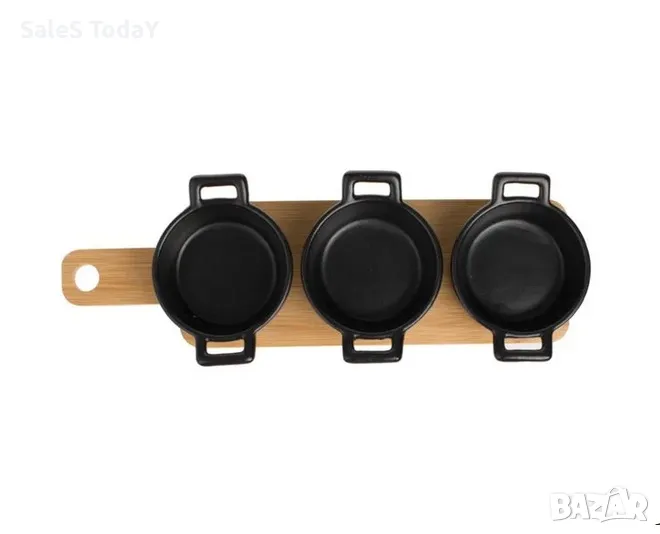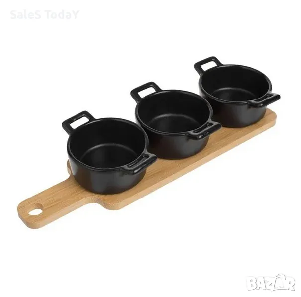 Мини дъска с бамбукова основа - поднос с дръжка и 3 черни керамични купи с дръжки (Ø7x3,5см). Идеален за сервиране на ядки, закуски и плодове, сосове, бонбони. Размери- 28x8x5cm