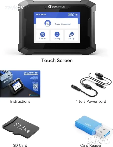 Сензорен екран SCULPFUN TS1 просто копира файловете за гравиране или рязане на SD картата на сензорния екран и след това завършва гравирането или резбата удобно и практически офлайн чрез 3,5-инчовия сензорен екран.