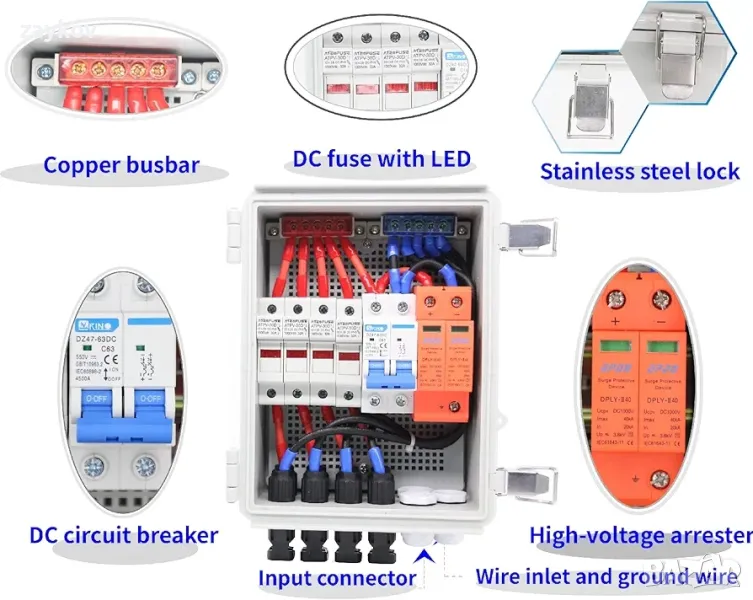 Дизайн на продукта: комбинирана кутия за слънчеви панели с 4 низа, IP65 водоустойчива с предпазител за защита от претоварване 15 A, държач за предпазител 32 A и предпазител за осветление. DC прекъсвач 63A,500V. (Мълниезащита) Защита от пренапрежение от мълния: DC1000V. Всички са преминали съответното сертифициране