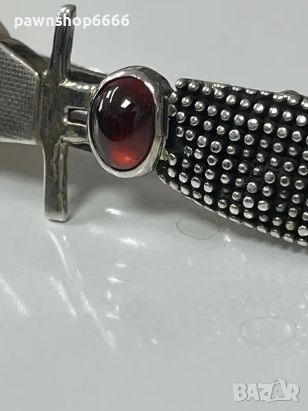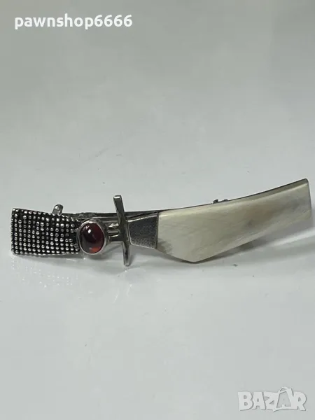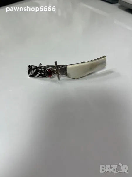 📌 Продавам изискана сребърна фиба, декорирана с естествен корнеол и елемент от рог.