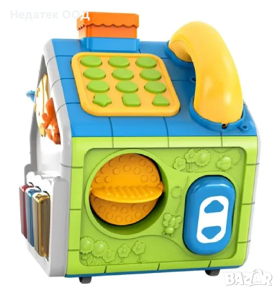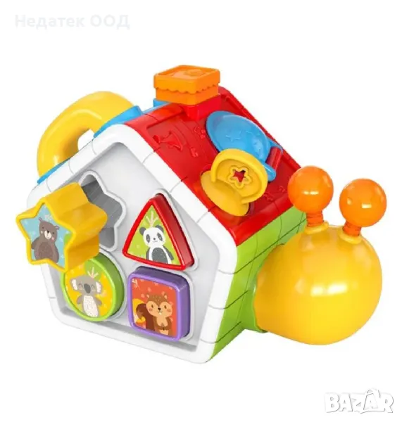 Образователно охлювче с къщичка и много занимания. Има огледало, което се върти наляво и надясно, форми, които детето да учи, телефон и занимания за упражнения с пръсти. Има бутон за активиране на музика и звуци на животни и движение със светлина. Работи с 3 AA батерии (не са включени).