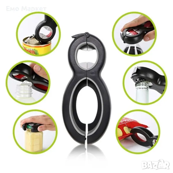 Удобна и практична 6 в 1 отварачка, идеална за бутилки, буркани и консерви.