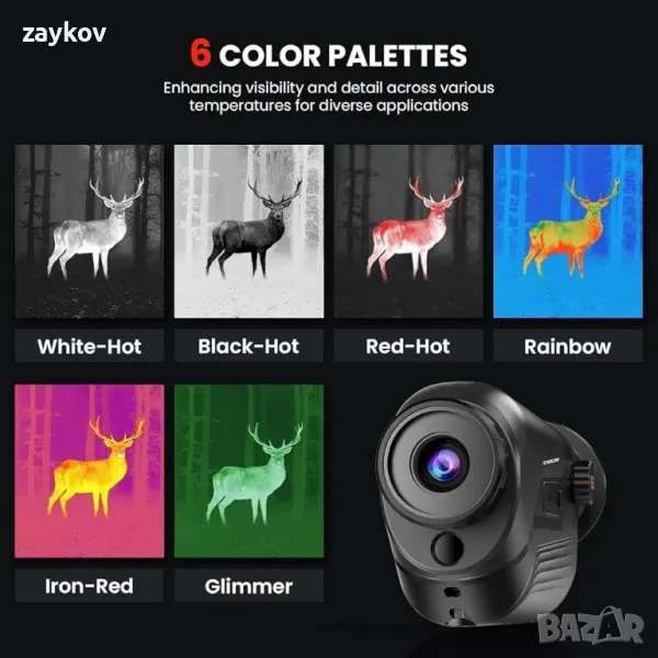 монокъл предлага разнообразна гама от режими на показване със своята 6 цветова палитра, включително бяло-горещо, черно-горещо, червено-горещо, дъга, желязно-червено и блестящо. Тези режими позволяват на потребителите бързо и точно да идентифицират обекти, отговаряйки на различни сценарии и предпочитания.