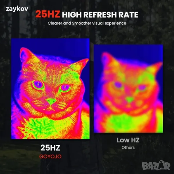 Технология за термично изображение: GOYOJO термовизионен монокуляр разполага с най-съвременен сензор за термична камера с размери 256 x 192 в комбинация с 12 μm инфрачервен детектор. Тази усъвършенствана технология осигурява термично изображение с висока разделителна способност, което дава на потребителите ясен и детайлен изглед на околната среда при условия на слаба светлина.