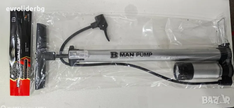 ЛУКСОЗНА РЪЧНА ВЪЗДУШНА ПОМПА С МАНОМЕТЪР MAN С ДВОЕН НАКРАЙНИК И З БРОЯ ПРИСТАВКИ ЗА ПОМПАНЕ НА ГУМИ НА АВТОМОБИЛИ, МОТОЦИКЛЕТИ, ВЕЛОСИПЕДИ, ТОПКИ, ДЮШЕЦИ И МНОГО ДРУГИ.