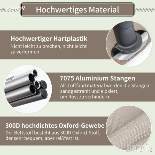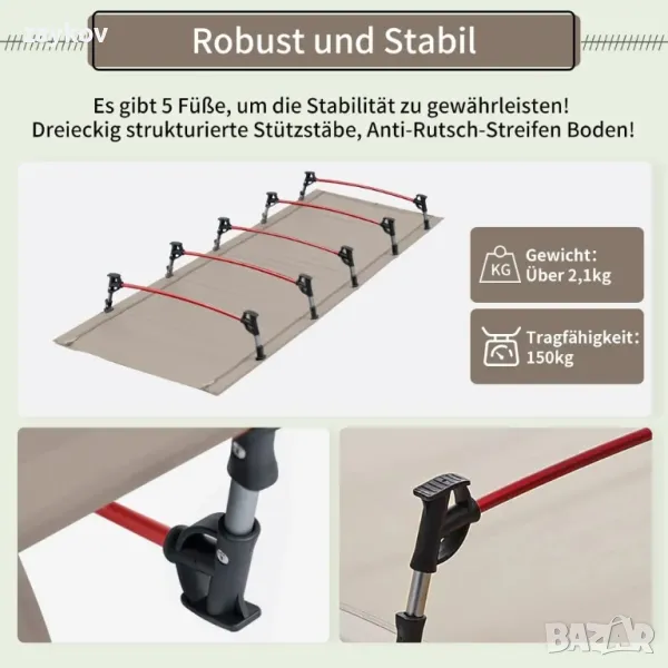 Издръжлив и здрав: Това сгъваемо къмпинг легло е изработено от катионен 300 плат, който е дишащ, твърд и устойчив на разкъсване. Опорните пръти с подобрена сгъваема найлонова връзка са изработени от самолетен алуминий 7075. Той е лек (1,95 кг), но здрав и стабилен и може да носи до 150 кг.