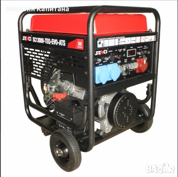 трифазен генератор SENCI SC-13000TEQ EVO ATS е с максимална мощност 11 kW и вместимост на резервоара 45 л. Генераторът е с електрически стартер. Той осигурява на трифазен и монофазен ток една и съща мощност. Машината работи 11 часа при 50% натоварване и 8 часа при 100% мощност. Оборотите на двигателя са 3600 об/мин. Агрегатът за ток има включен AVR регулатор на напрежението и ATS свързаност. Оборудван е с датчик за недостиг на маслото, а на контролния панел има дисплей, показващ часове на работа, волтметъра и честотата. Към него има включени колела и батерия.