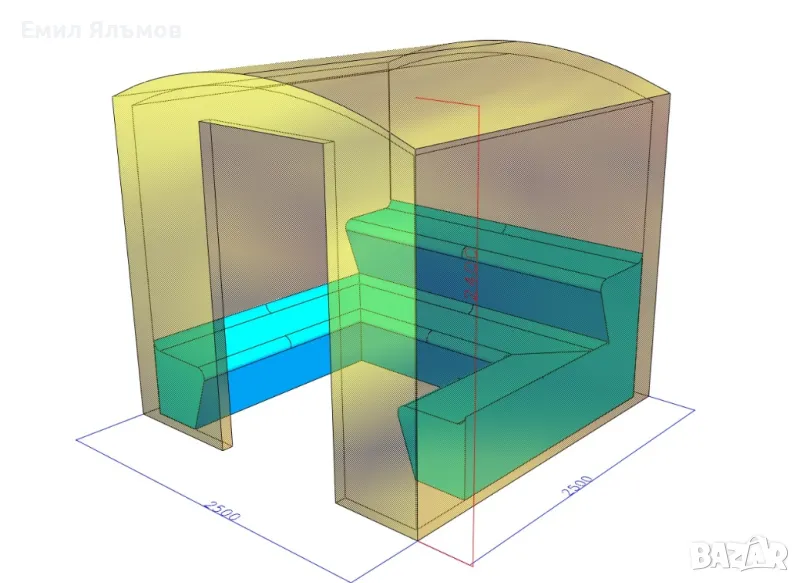 Свободно стояща Парна кабина с 7 седящи или 4 лежащи места. Кабината е оптимизирана така, че в малък обем да се събърат повече хора, Също така малкия обем предразполага да се използва по-маломощен парогенератор.