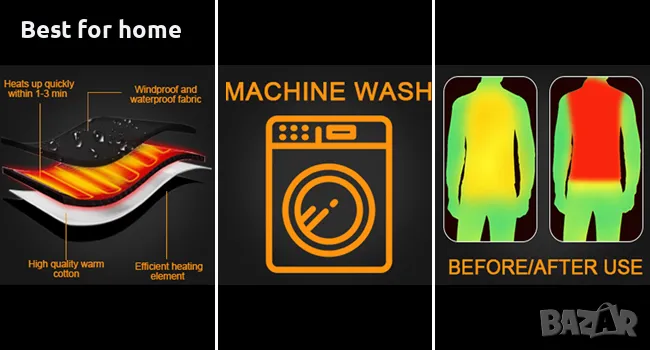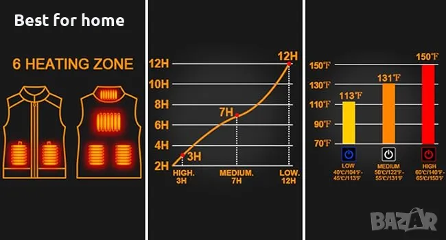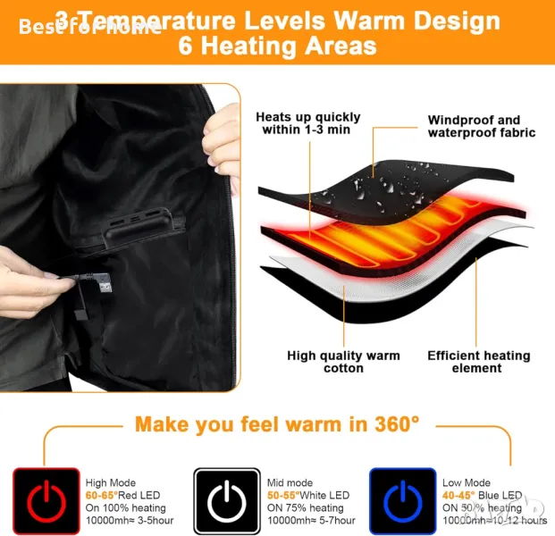 【Различни НАГРЕВНИ ЗОНИ】6 нагревателни елемента от въглеродни влакна на жилетка с нагряване на батерии генерират топлина в корема, талията, врата и горната част на гърба, след което постепенно се затоплят до цялото тяло.