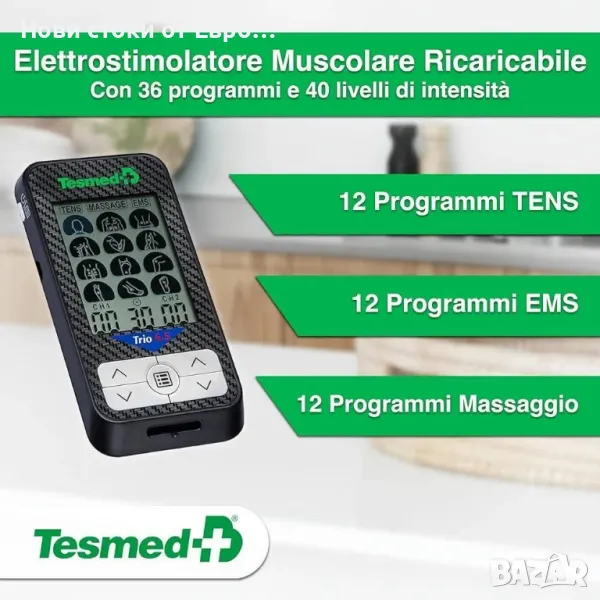 Уред за облекчаване на болка и мускулна стимулация TESMED Trio 6.5 TENS/ EMSУред за облекчаване на болка и мускулна стимулация TESMED Trio 6.5 TENS/ EMSTESMED Trio 6.5: USB-акумулаторна TENS единица за облекчаване на болката и EMS Мускулен стимулатор, 36 програми, 40 нива на интензивност, 4 електрода - EMS, TENS и масаж - идеални за фитнес и болкоуспокояваща терапияОтносно този артикулМНОГОФУНКЦИОНАЛЕН И ПРЕЗАРЕЖДАЕМ: Tesmed Trio 6.5 е универсален мускулен стимулатор с акумулаторна батерия. Разполага с 36 програми, включително TENS за облекчаване на болката, EMS за тонизиране на мускулите и функция за масаж за цялостно благосъстояние. Това устройство е идеално за широк спектър от фитнес и терапевтични нужди.УСЪВЪРШЕНА ТЕХНОЛОГИЯ: С 40 нива на интензивност и 2 канала, Trio 6.5 предлага силно персонализирано и мощно изживяване. Предлага се с 4 предварително желирани електрода, което елиминира нуждата от допълнителен гел и прави употребата по-удобна. Електродите Tesmed са висококачествени и по-издръжливи от подобни продукти на пазара.ТОНИЗИРАНЕ НА МУСКУЛИТЕ: Устройството предлага 12 EMS програми, специално предназначени за подобряване на мускулния тонус. Той е идеален за стягане и тонизиране на корема, бедрата, задните части, ръцете и краката, като същевременно насърчава възстановяването на мускулите след тренировки.ОБЛЕКЧАВАНЕ НА БОЛКАТА: Tesmed Trio 6.5 включва 12 TENS програми, които ефективно лекуват различни състояния на болка, като тендинит, болка във врата и болка в долната част на гърба, без необходимост от лекарства. Включено е ръководство за потребителя с 67 цветни илюстрации за правилното поставяне на електродите.КОМПАКТЕН И ПРАКТИЧЕН ДИЗАЙН: С компактни размери (12 x 6 x 1,6 cm), устройството е лесно за пренасяне и използване навсякъде. Той също така включва многоезично ръководство с подробни инструкции за оптимизиране на употребата както за обучение, така и за терапия на болката.