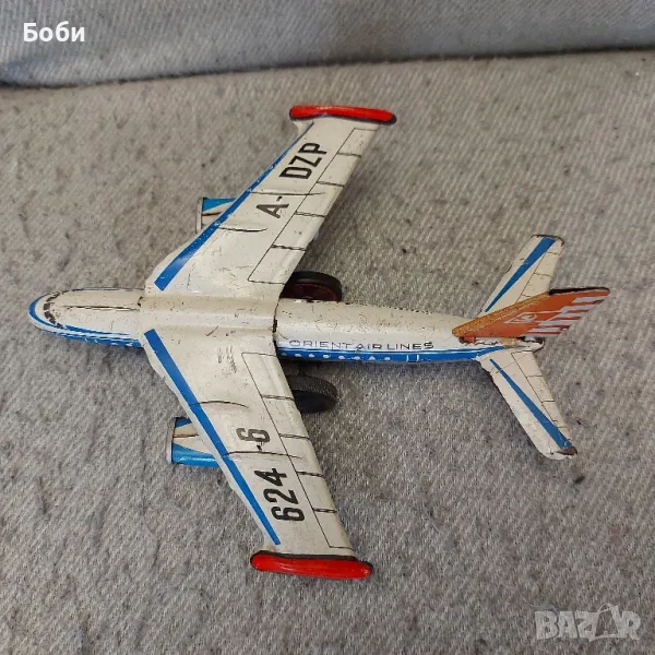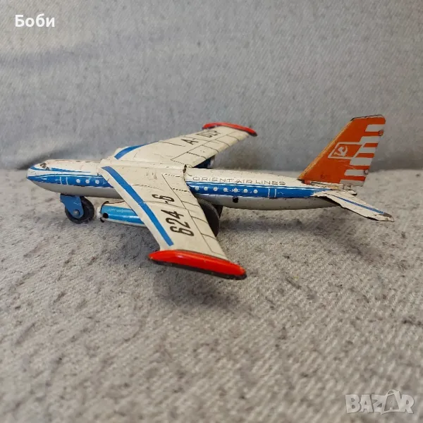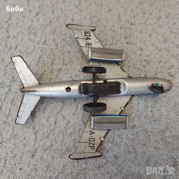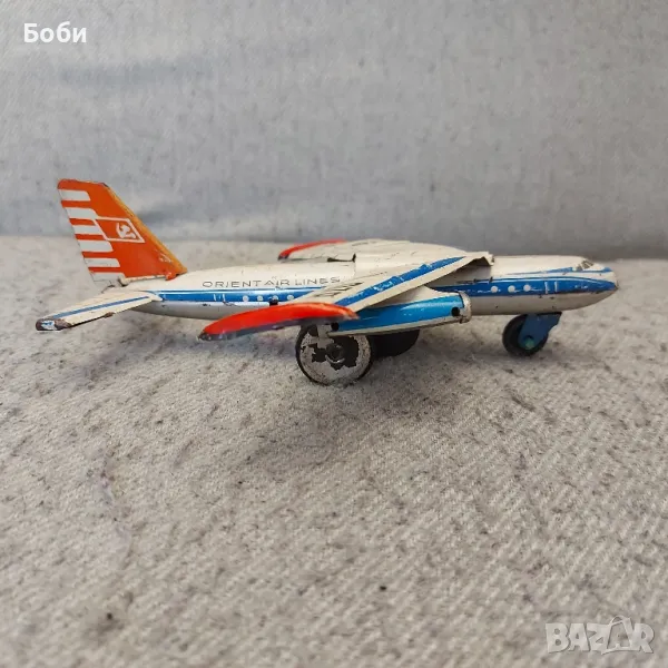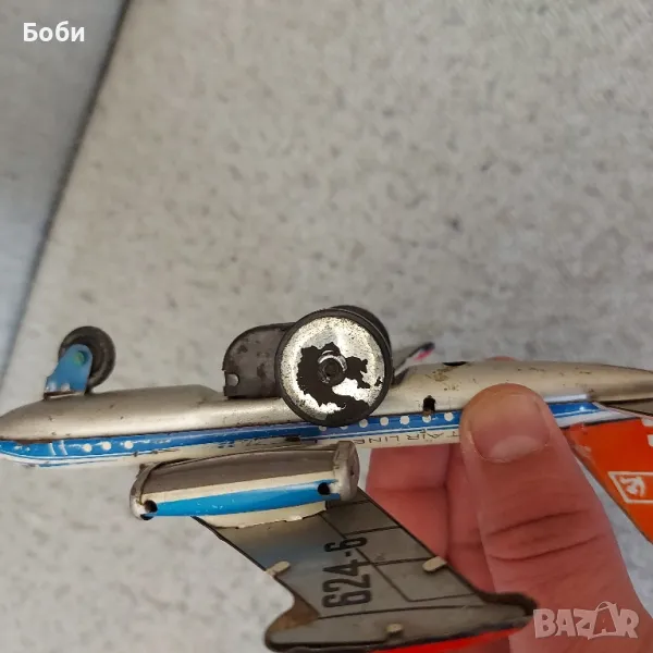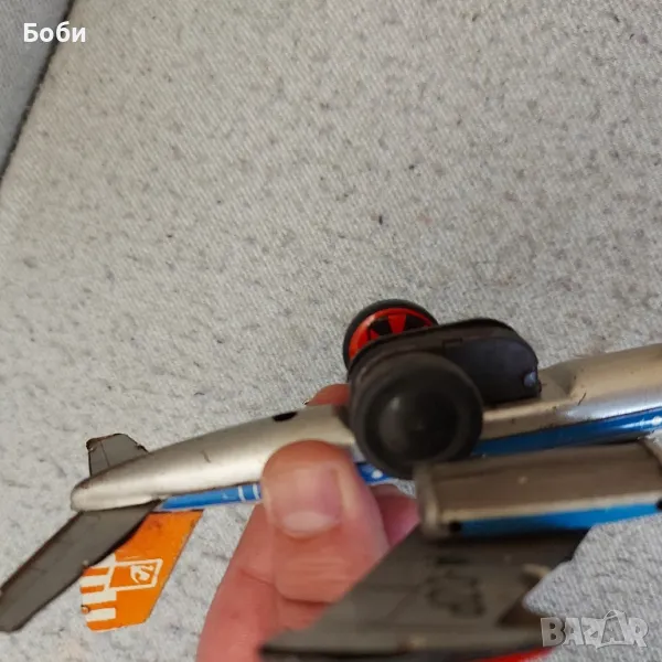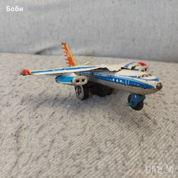 Стара Соц Ламаринена Играчка Самолетче.Дължина около 18смМеханизма работи. Задните гуми ми се виждат различни, не знам дали са така.