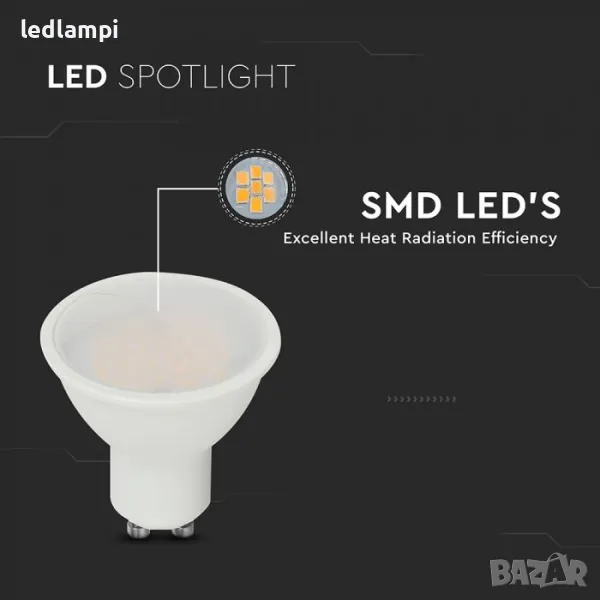 LED лампа Мощност: 10W Plastic Цокъл: GU10 Работно напрежение: 220-240V, 50Hz LED Модел: SMD Ъгъл на светене: 100 ° Светлинен поток: 1 000 lm Цвят на светлината: Неутрално Бяло 4000К Полезен живот: 20 000 часа Енергиен клас: F Степен на защита: IP20 Работна температура: -20°C до +45°C Димиране: Не Цикли на включване/изключване: > 20 000пъти CRI>80 PF >0.5 Размери: Φ50 x H56.5 mm