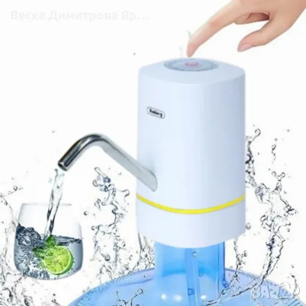 помпа за вода;Двойна помпа: Да, за по-бързо и ефективно изпомпване;Материал на тръбата: Неръждаема стомана, осигуряваща издръжливост и дълготрайност;Светлинен индикатор за зареждане: Показва нивото на заряда на батерията;Адаптер за бутилки: Съвместима с бутилки от 3, 5, 8, 10 и 11 литра;Подходяща за бутилки от 19 литра: Без пластмасовия адаптер;USB зареждане: Включва кабел за зареждане чрез USB порт;Силиконова тръба: Включва силиконова тръба за изпомпване на вода;Тип батерия: Акумулаторна;Преносимост: Лесно преносима благодарение на безжичната работа;Обхват на използване: Подходяща за домакинства, офиси, и всяко място, използващо големи бутилки с вода.