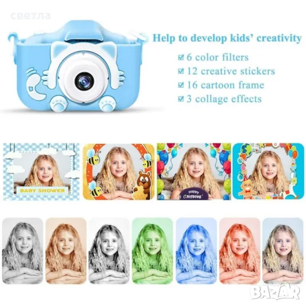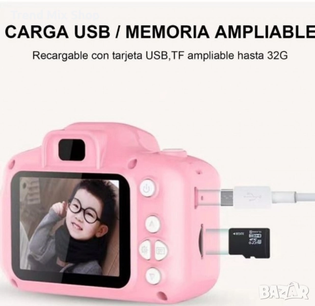 Тип продукт: Мини фотоапарат;Възраст: 3+ години;Материал: Пластмаса, Силикон;Развитие на умения: Визуално възприятие, координация, въображение;Изображение: 2MP - VGA / 720P / 1080P;Формат: AVI, JPEG;Дисплей: 2-инчов TFT екран;Интерфейс: Micro USB;Слот за карта: TF/SD до 64GB (не е включена);Захранване: 3.7V 600mAh;Време за зареждане: 2 часа;Време на работа: До 2 часа;Допълнителни функции: Самоснимачка, цветни филтри, фоторамки;Игри: 5 броя (Змия, Тетрис, Охлюв в лабиринт и др.);Размери: 10 × 6.5 × 5 см;Тегло: 97 г;Цветове: Син, Розов;Гаранция: 12 месеца.