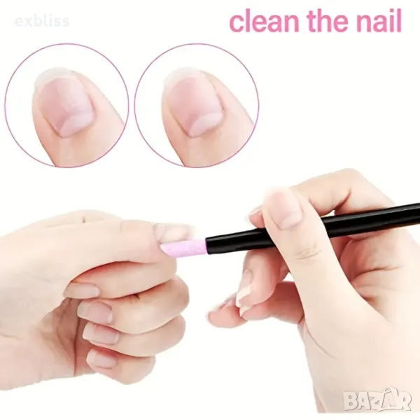 - Избутване: Внимателно избутайте кожичките назад с помощта на керамичния избутвач. Движете се нежно и плавно, следвайки естествената форма на нокътя.