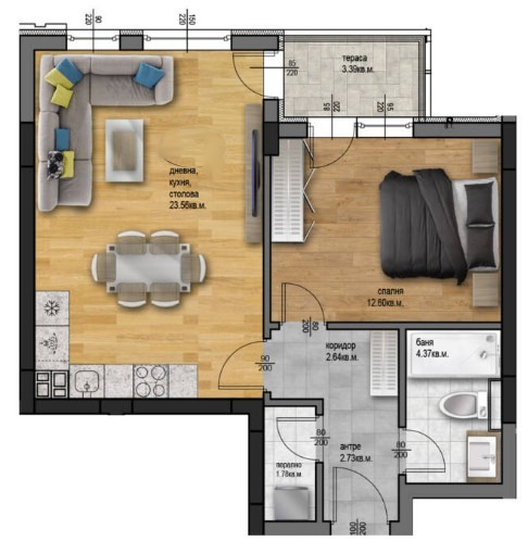 Жилището, което предлагаме за продажба е двустайно с югоизточно изложение, състои се от дневна с кухненски бокс и трапезария- 23,58 кв.м, спалня -12,74 кв.м, баня с тоалетна, входно антре, перално помещение и тераса.