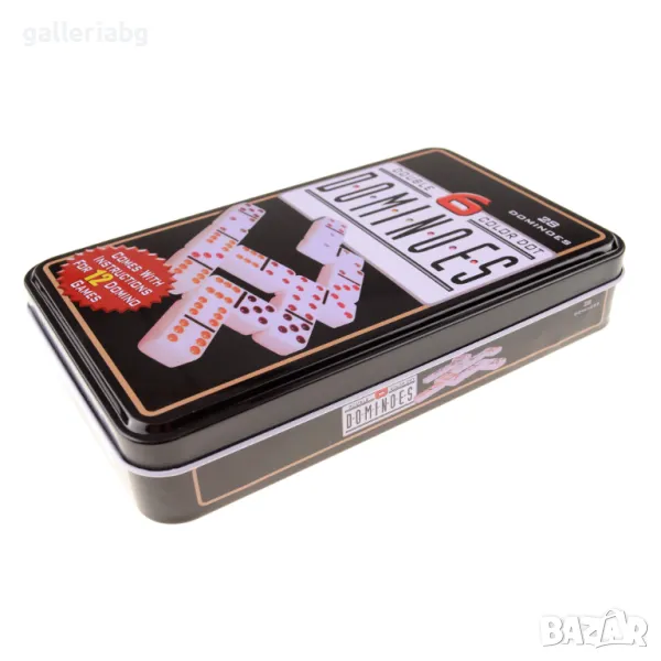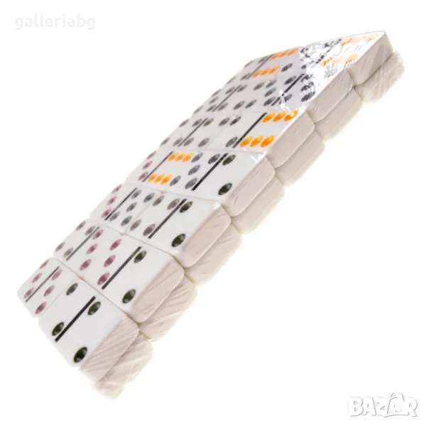 Класическо домино с 28 броя плочки. Точките оформящи всяка цифра са в различен цвят така детето ще опознае по-лесно числата.