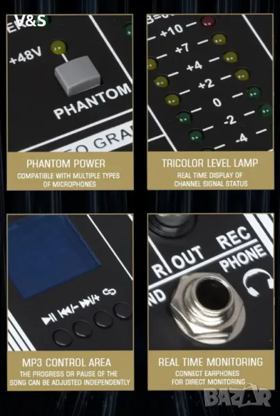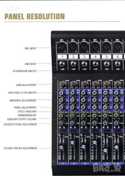 Съвместимост на миксер с различни устройства, като връзка с микрофон/инструмент, която е подходяща за семейни KTV, изпълнения на групи, дейности в кампуса, конференции и други поводи. Аудиото поддържа кабелна/безжична/кондензаторна връзка с микрофон/инструмент, подходящо за домашно KTV, изпълнение на група, събития в кампуса, конференции и други поводи.