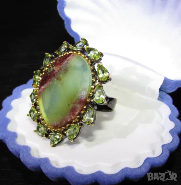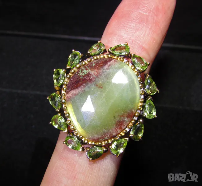 925 сребърен пръстен с родиево покритие, камък хризопрас 2.3см. Халка 1.85, произход Африка. Другите камъни са перидот. Цена 140лв.