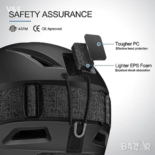 Перфектна защита: снежната каска е направена от три слоя калъпи. Първият слой на поликарбонатната обвивка може да издържи на силен удар. Запълването на втория слой с EPS може ефективно да намали въздействието. Третият слой е мека вътрешна подплата, която ви осигурява много приятен комфорт при носене.