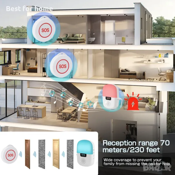 【Обаждане с разширен обхват】: На открито този продукт за подпомагане на възрастни хора на приемника и бутона за спешно повикване достига 330 фута/100 м. Важно е да се отбележи, че сигналът на приемника на пейджъра за аварийно предупреждение може да бъде нарушен от стени или метал, така че е препоръчително да го поставите близо до Wi-Fi предавателя, за да избегнете всякакви смущения, които могат да повлияят на нормалната употреба. В допълнение, паник бутонът може да добави няколко SOS бутона (до 5) едновременно, за да отговори напълно на нуждите на вашето семейство.