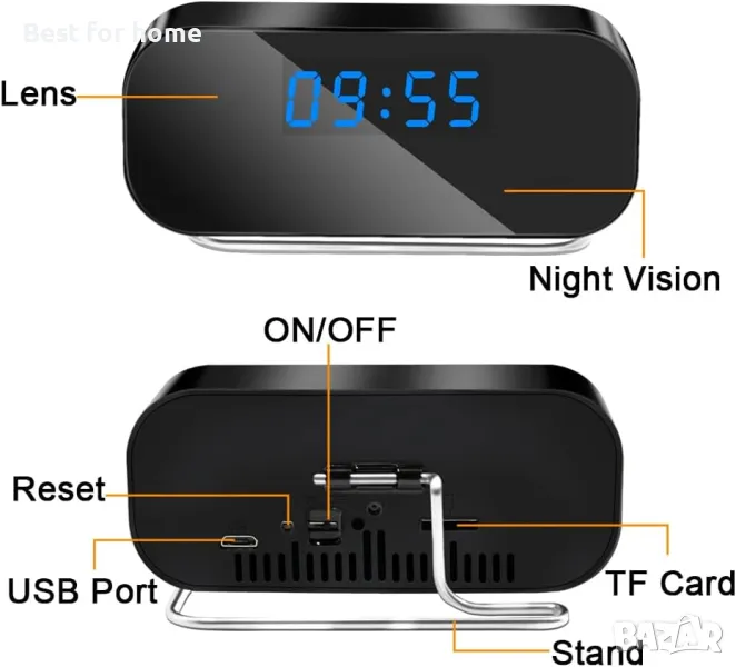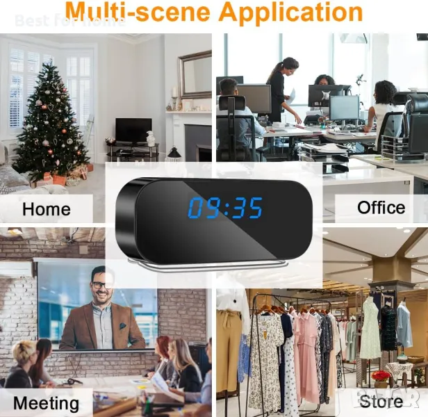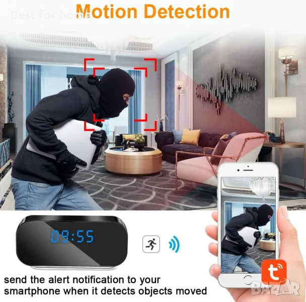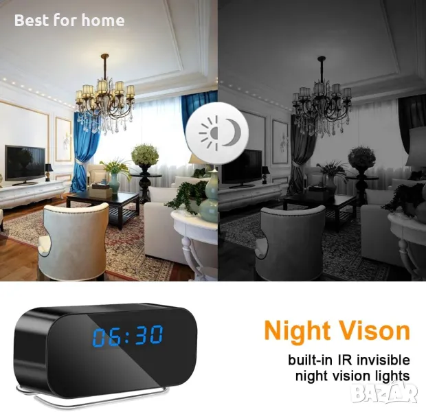 【Умен часовник】Гъвкава шпионска камера с компактен HD обектив за ясен 1080P HD видео поток през 2,4 GHz или 5 GHz Wi-Fi в приложението. Усъвършенстваната функция за нощно виждане гарантира яснота дори в най-тъмната среда. Бъдете нащрек с откриване на движение, получавайки незабавни сигнали и моментни снимки от това смарт устройство