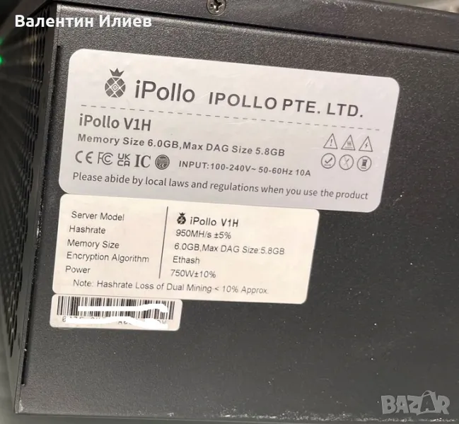Крипто майнер IPOLLO V1H 950MH, 750 вата. Копае следните монети Ethash,ETC, QKC, CLO, POM, ZIL. Ако се настрой да копае OCTA, копае три OCTA+ZIL+PAC. Работи от няколко месеца. Лично предаване.