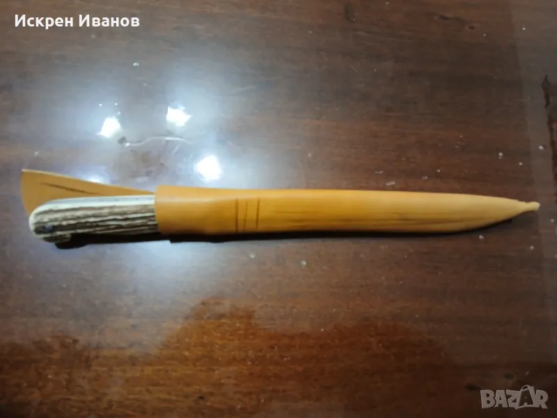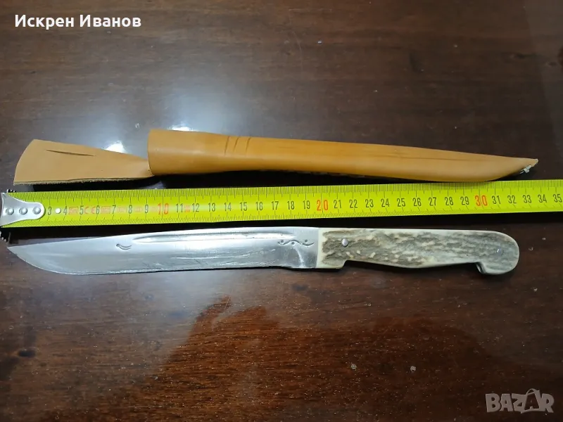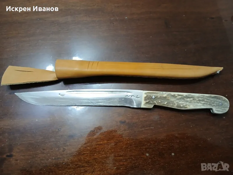 На вашето внимание, стар хубав нож с еленови чирени и прекрасна кожена кания, подходящ както за лов, така и за туризъм в планината.