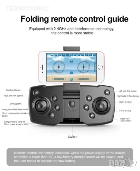 Със своя лек и преносим дизайн дронът Е59 се нарежда в най-ниския тегловен клас дронове, което може да го освободи от определени разпоредби в много страни. С превъзходна стабилност и невероятни кадри. Поддържа въздушни снимки и видео с кристално чисто качество, идеално за социалните медии. Благодарение на лекия си дизайн, може да се насладите на 15-20 минутен полет, извличайки повече от всяко приключение, което да запаметите завинаги. Само с няколко докосвания може да генерирате страхотни видеоклипове. Бързо и лесно за работа. Контролерът е изключително лесен за работа, даващ ви пълна свобода при заснемане на любими места и хора. Честотата, на която работи супер маневреният