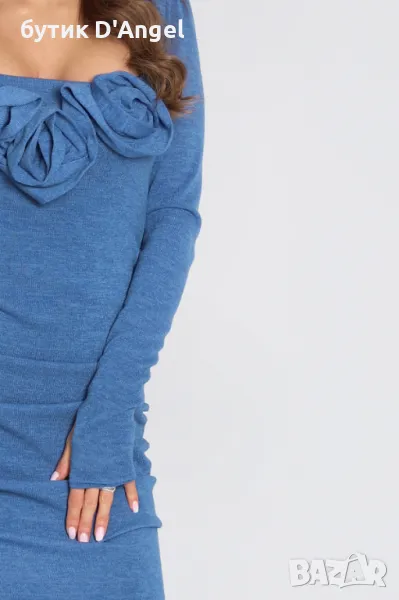 Нежна, елегантна, различна – рокля от меко, силно еластично стегнато плетиво в разкошен син нюанс с ръчно декорирани текстилни рози от материята. За устойчивост роклята е изцяло подплатена. Кройка с набори, благодарение на които можете да варирате, за да прикриете несъвършенства.