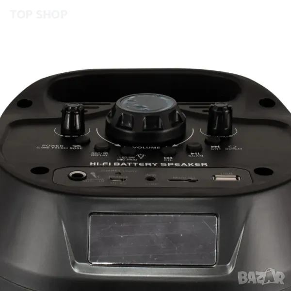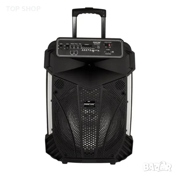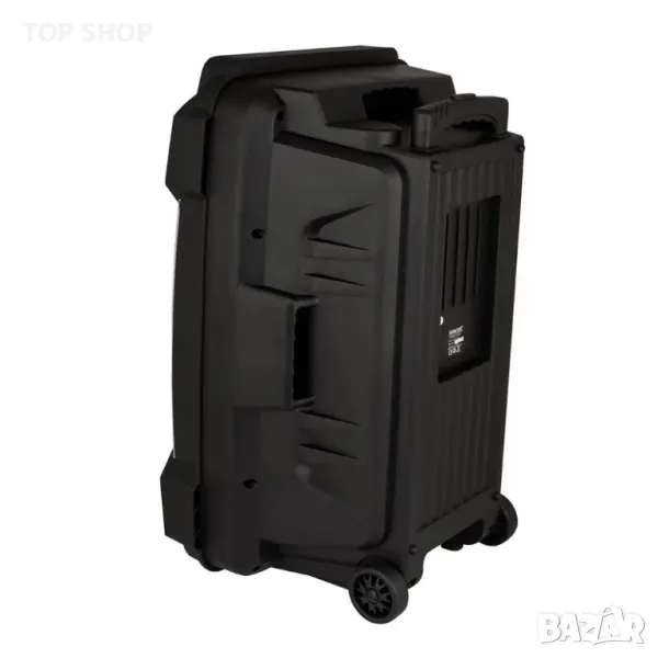 Говорители: 15" + 3"; Функции: USB/TF слотове, FM радио, Bluetooth; Цветно осветление: Да; Дръжка и колела: Да; Батерия: 7.4V/1800mA; Честотна характеристика: 20Hz-20kHz; Чувствителност: 65dB; Съпротивление: 3 ohm; Мощност: 16W; Аксесоари: USB кабел, дистанционно управление, безжичен микрофон; Цвят: Черен; Нето тегло: 8.2kg; Бруто тегло: 9.6kg; Размери: 368х310х545mm.