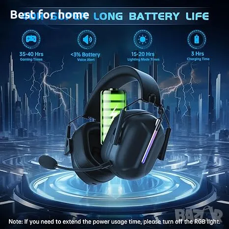 Цветни RGB и разширена батерия .Безжичните слушалки за игри могат да ви държат потопени в игри до 40+ часа. Режимът на RGB осветление осигурява цветно забавление с елегантен дизайн. Когато нивото на батерията на тази безжична слушалка за компютърни игри падне под 3%, ще се активира гласово предупреждение. Тези безжични слушалки ps5 с микрофон отнемат само 2,5 часа, за да се заредят напълно и можете да продължите да използвате слушалки ps4 с микрофон, докато зареждате без прекъсване.