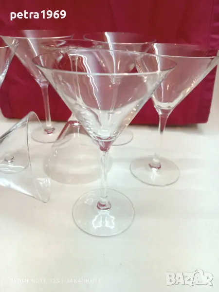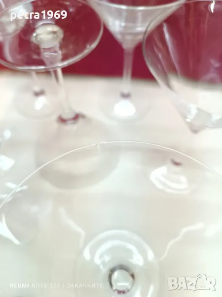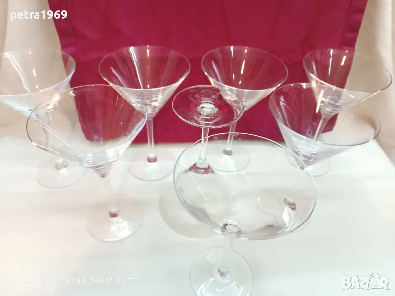 Високи стъклени чаши на столче за коктейли. Побират по около 220-230 мл., височината им е 19 см., диаметърът е 12 см., горната част е с дълбочина 9 см. Седемте са напълно здрави, без наранявания, осмата има лекичко чукване на гърлото. На снимката са в компанията на "Нона" за кафе заради размера. Цена за една чаша - 7 лв. Ако се поръчат седемте заедно, общата сума ще е 40 лв., а осмата ще дойде с тях за компания.