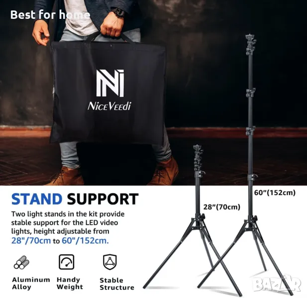 Комплект LED видео осветителни тела, NiceVeedi Studio Light, 2800-6500K Димируем комплект фотографски осветителни тела със стойка за статив и държач за телефон, 73" поточна светлина за видеозапис, поточно предаване на игри, YouTube