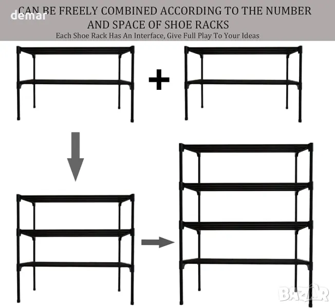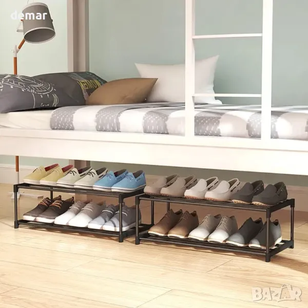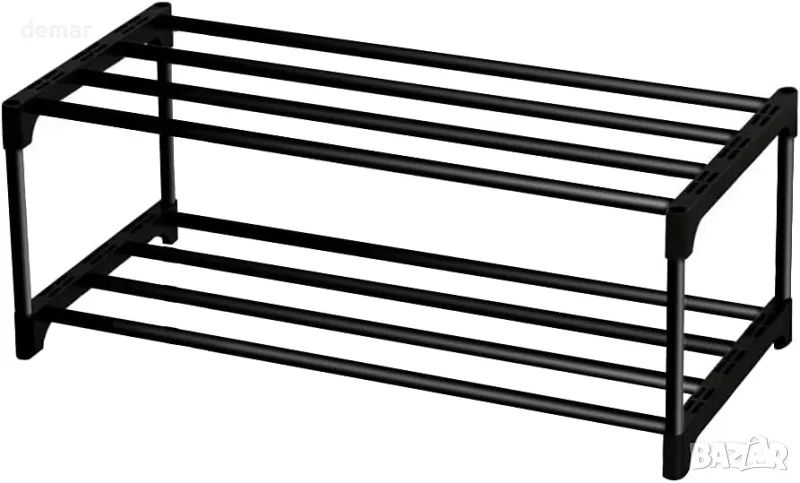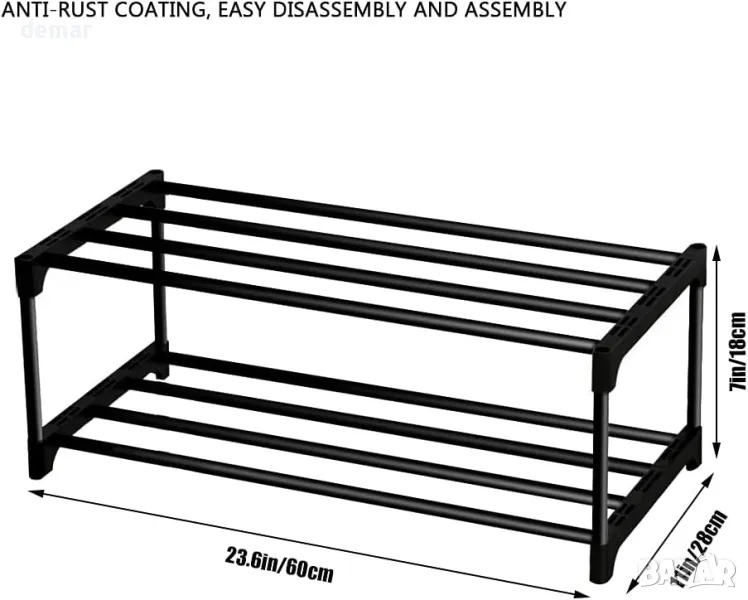 Издръжлива поставка за обувки, изработена от дебела стоманена тръба с покритие против ръжда и здрави пластмасови втулки за стабилност. Лесен за сглобяване за минути без проблеми. Компактен и спестяващ място, идеален за организиране на обувки или други предмети в домове, апартаменти или общежития. Размери на продукта 27.9D x 60W x 18H сантиметра