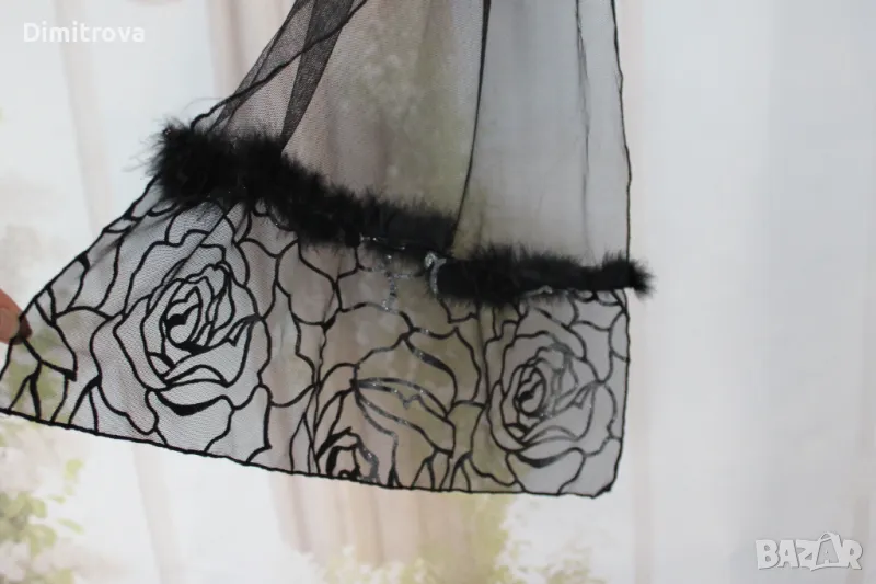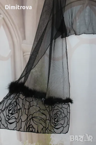 Роклята е с гол гръб, с елегантни кръстосващи се презрамки, обсипана с черна дантела и блестящ брокат, разкроена в долната част ( необходимо е да се носи със залепващи силиконови чашки, поради липсата на подплата и бюстие в горната част). Към роклята има атрактивна наметка от мека материя, с акцент - пришити пера в долната част на свободно падащите ръкави.