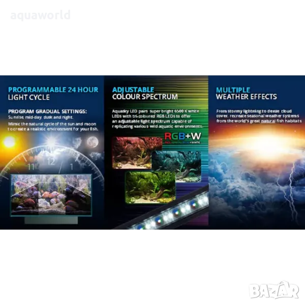 Това осветление е подходящо, както за морски, така и за сладководни аквариуми. Можете да го управлявате бързо и лесно директно от мобилния си телефон с приложението FluvalSmart, което може да изтеглите безплатно от App Store или Google Play. То е снабдено с програмируем 24-часов светлинен цикъл, включващ изгрев, ден, залез и нощ. Осветлението пресъздава ефекти като облачност, лунна светлина, буря и светкавици, като има и няколко предварително създадени настройки на светлината.