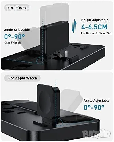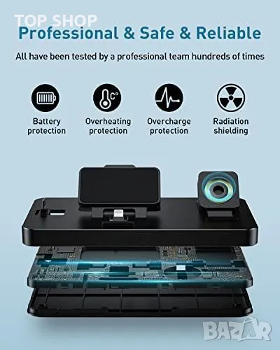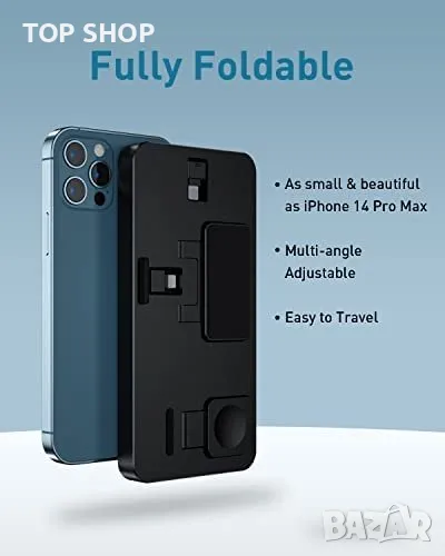 Зарядната станция Tophot 3 в 1 е компактна и преносима сгъваема зарядна станция, която може да зарежда iPhone, Apple Watch и AirPods едновременно. Тя е лека и лесна за пренасяне, което я прави идеална за пътуване или домашна употреба. Станцията е удобна за калъфи и може да зарежда устройствата ви, без да е необходимо да сваляте калъфа. Съвместима е с всички модели iPhone, AirPods и Apple Watch и е снабдена с многофункционална защита, която предотвратява прегряване, презареждане и късо съединение. Регулируемият дизайн ви позволява да регулирате стойката за телефон и докстанцията за Apple Watch според нуждите си, като осигурява стабилно и сигурно зареждане.