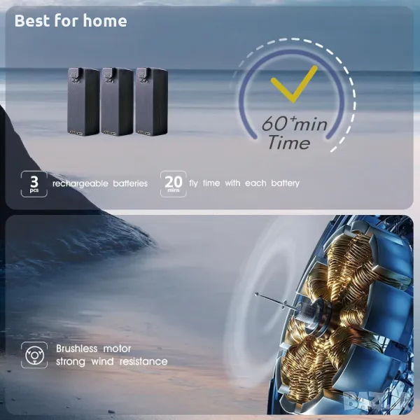 【Силни безчеткови двигатели и модернизирани батерии】Издръжливите безчеткови двигатели от сплав се отличават със силна устойчивост на вятър, осигурявайки по-бърз, по-тих и по-мощен полет. Оборудван с 3 подобрени батерии, той може да осигури до 60 минути полетно време, позволявайки на вашия дрон да пътува свободно в небето.