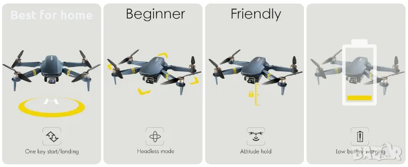 【Всички функции】Позициониране на оптичен поток, задържане на надморска височина, изглед от първо лице (FPV), излитане и кацане с един клавиш, обръщане и преобръщане с един клавиш, следвай ме, полет по траектория, режим без глава, регулиране на скоростта, селфи с жестове, пъргаво летене и др.