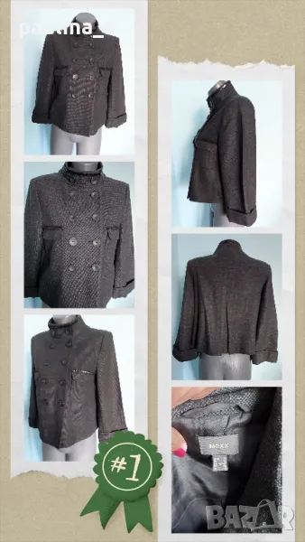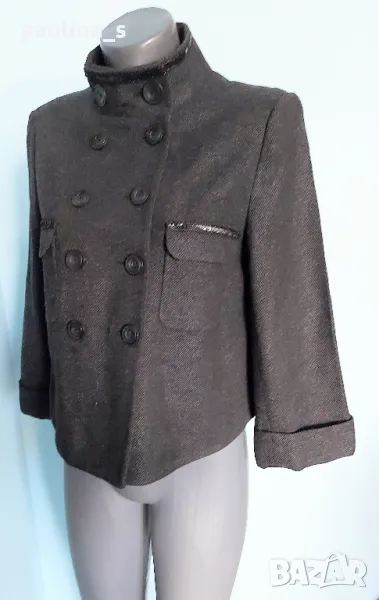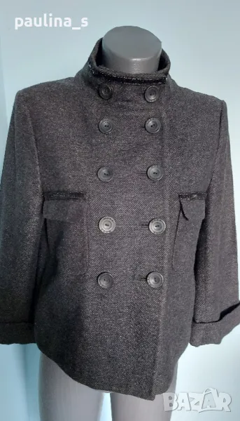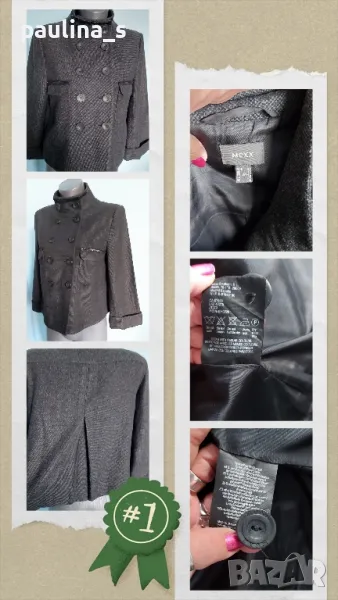 2️⃣ . Колаж / М / L - "Mexx". Цената е крайна 29,99лв / 15 евро. Късо дизайнерско сако с двуредно закопчаване в стил Коко Шанел, ръкави 7/8, декорации на джобовете и яката, хастар. Платът е със съдържание на вълна, без еластичност. На живо е хипнотично красиво. Без дефекти и етикет, аутлет.