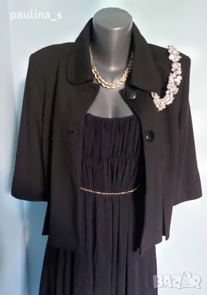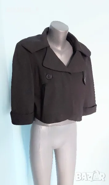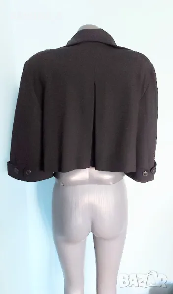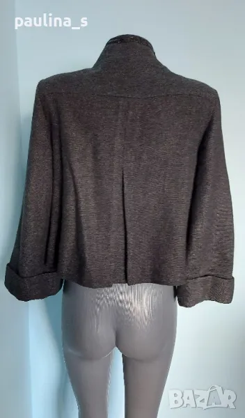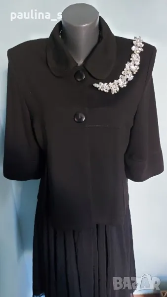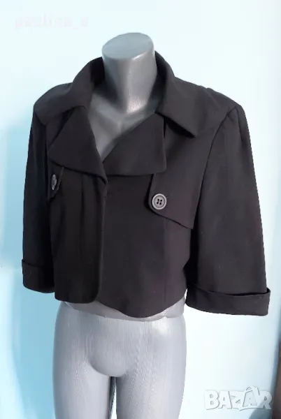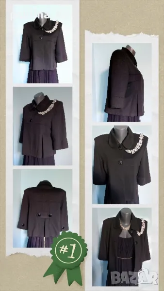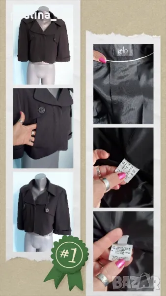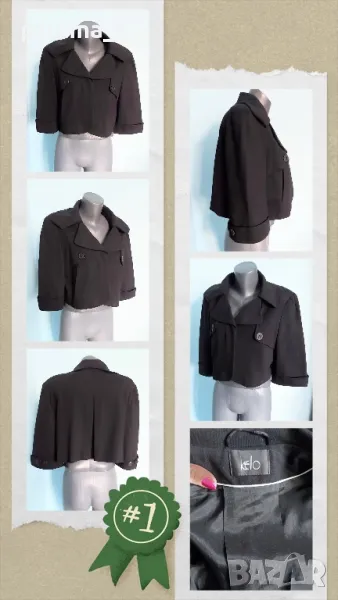 1️⃣ . Колаж / L / 2XL - "Kello". Цената е крайна 39,99лв / 20 евро. Разкошно дизайнерско късо сако / топ с плоха отзад и джобове, модел Кардиган. Ръкавите са 7/8, има хастар, яката е разкошна, двойна и висока отзад. Платът е плътно трико, пада тежко и стои елегантно. Материята е еластична, може да се носи и от 2XL. Без дефекти и етикет, като ново.