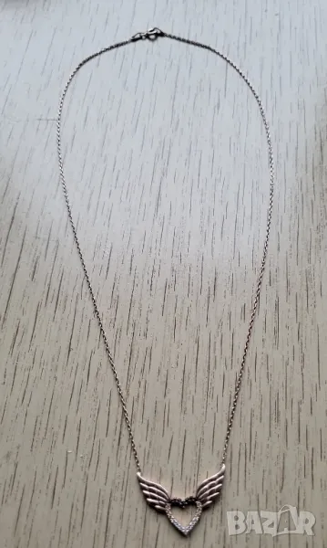 Нежно сребърно колие с ангелски крила и сърце с бели и черни цирконий. Колието е позлатено с розово злато. Има леко обезцветявсне на позлатата на задната страна на крилата.