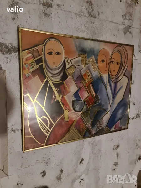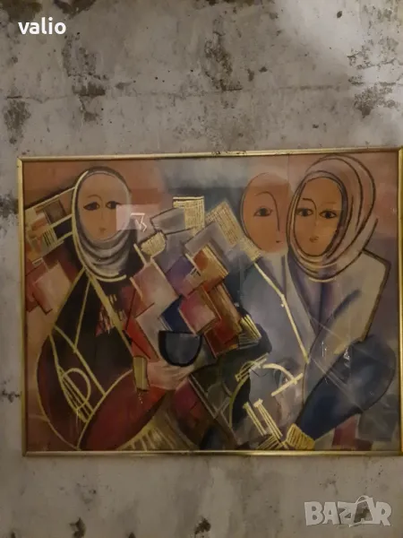 Има стъкло отпред което е пукнато умишлено не съм го махнал понеже не пречи и да пази картината,размери 72-56см.