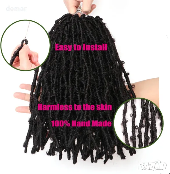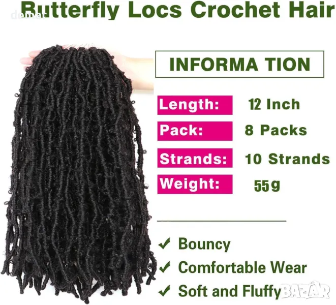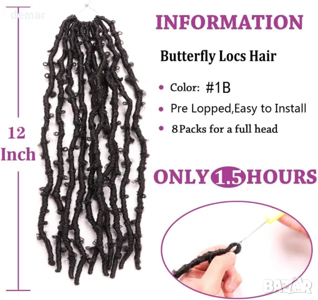 Предварително заплетени пеперудени изкуствени локове, изработени от висококачествени японски влакна, са меки, леки и удобни за кожата. Поставят се лесно, с тънка горна част за естествен вид и минимална поддръжка. Косата е пълна, спретната и без неприятни миризми. Всеки пакет съдържа 12-инчови локове, като обикновено са необходими осем пакета за пълна глава. Предварително усукани и с индивидуална верига, те спестяват време по време на монтажа.