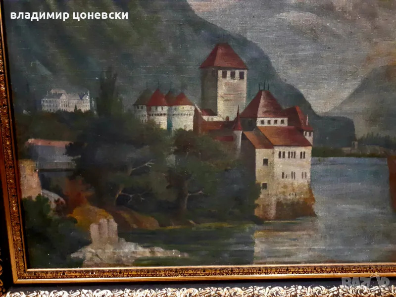 Стара маслена картина изобразяваща Шильонския замък в Швейцария.Замъка е бил затвор.Размери с рамката 70/56 см.