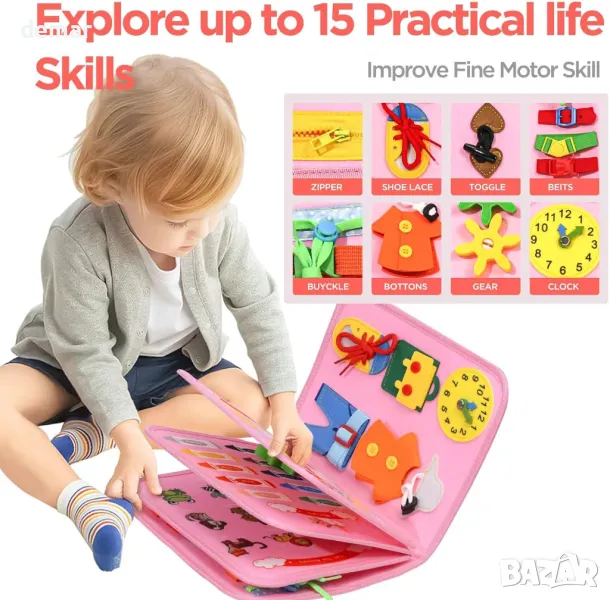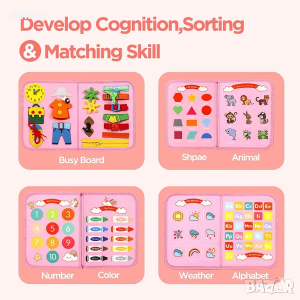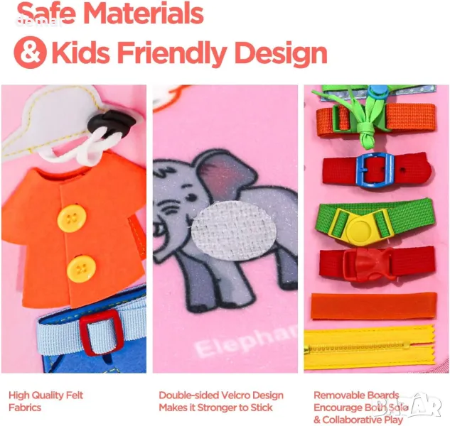 Тази образователна дъска 7 в 1 предлага 8 страници с 21 увлекателни дейности, предназначени да развият когнитивните и двигателните умения на малките деца. Включва елементи като азбуки, числа, форми, метеорологични символи и задачи за житейски умения като катарами, връзки за обувки, ципове и копчета. Функции на Монтесори като пъзели, часовник и календар подобряват ученето. Гъвкав цип позволява да се раздели на две дъски за споделена игра. Изработен от мек, нетоксичен филц без остри ръбове, той гарантира безопасност. Преносим за пътуване, той разполага с издръжливо велкро за стабилно използване и насърчава както самостоятелна, така и съвместна игра. Страхотен подарък за малки деца.