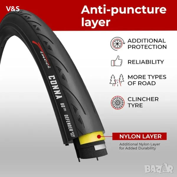 1 мм дебел слой от гъвкава гума против пробиване предлага трайна защита от остри предмети. Изработен от висококачествен найлон и каучукова смес. Корда от стоманена тел за подсилване на гума