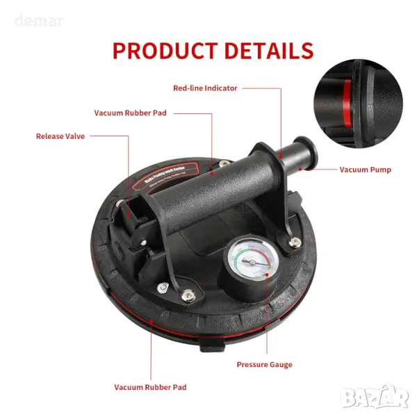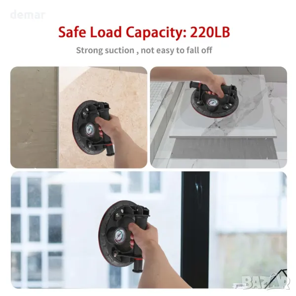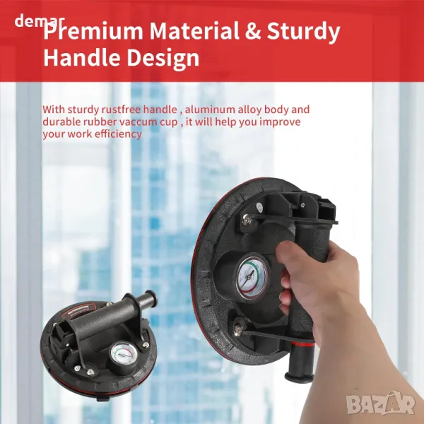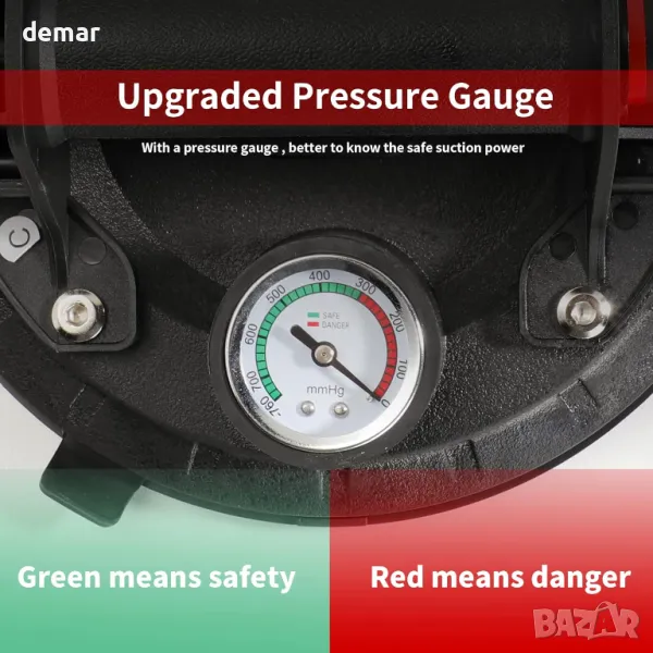 Тази вендуза за повдигане разполага с подобрен манометър за наблюдение на адсорбционното налягане, осигурявайки по-безопасна употреба чрез предотвратяване на падане на предмет. Той разполага с неплъзгаща се гумена вендуза и ергономична ABS пластмасова дръжка за комфорт. С висок капацитет на натоварване до 100 кг (220 lbs) вертикално, той е идеален за работа с тежки предмети като стъкло, плочки, огледала, ламарина и др. Идеален за различни гладки повърхности, включително предни стъкла на автомобили и дървени панели, повдигачът предлага гъвкавост. Не забравяйте да премахнете пластмасовия капак за прах и се уверете, че повдиганият материал е гладък и без прах за оптимална работа.